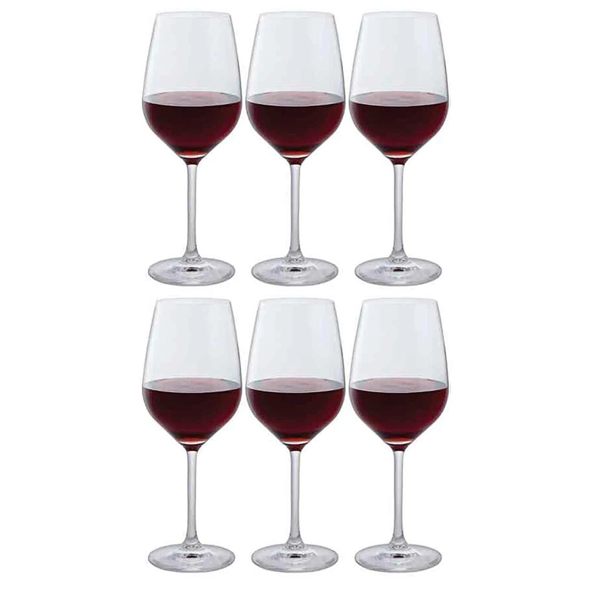 Set of six generous red wine glasses that will add to your drinking pleasure. An ideal choice for any occasion or as a gift.