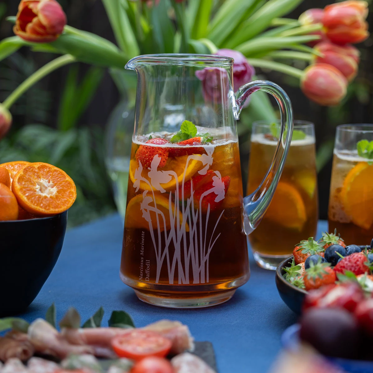 The Bloom Daffodil Jug is a beautifully handcrafted piece, perfect for serving drinks with elegance. Adorned with an intricate etch of nodding daffodil heads, this jug combines functionality with timeless design. Its tapered profile and solid glass handle provide a comfortable pour, making it ideal for water, juice, or chilled beverages.